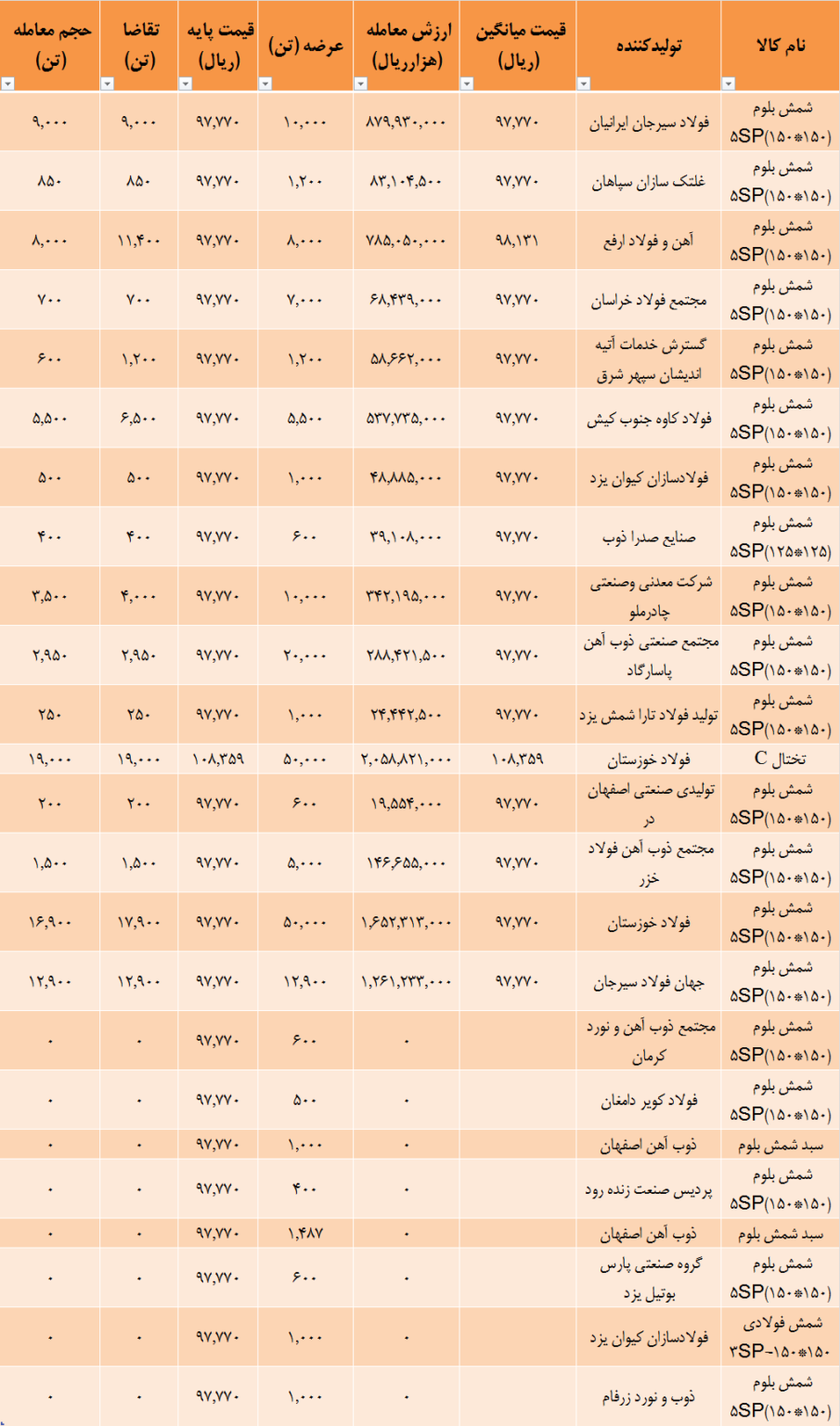 معاملات امروز شمش فولادی عمدتاً در قیمت پایه ۹۷۷۷ تومانی به ازای هر کیلو انجام شد و ۸ عرضه به دلیل نبود تقاضا به معامله ختم نشد.